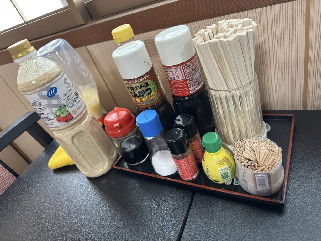 各テーブルにドレッシングやソースが揃っているので、好きなタイミングで味を変えられるのがとても便利です。