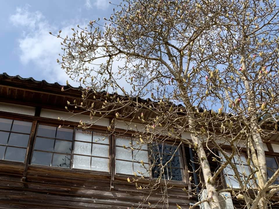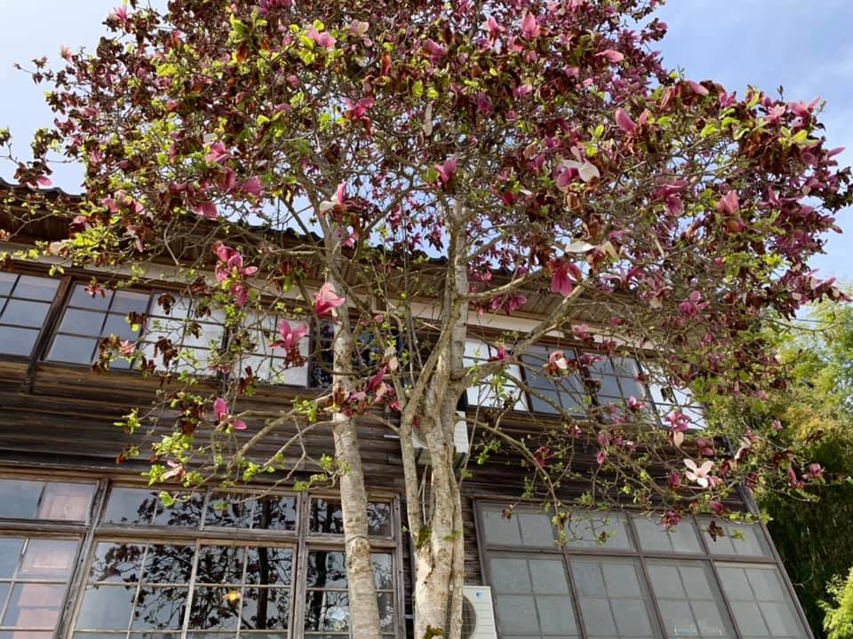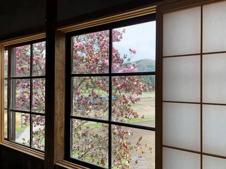 大きな木蓮と、長閑に広く広がる田園風景が窓越しに見ることができます。