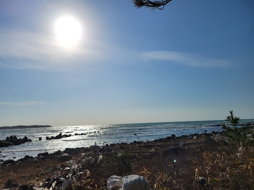 右手に波打ち際があるのに、正面にも海が見えます。そういった変わった地形の砂浜です。
