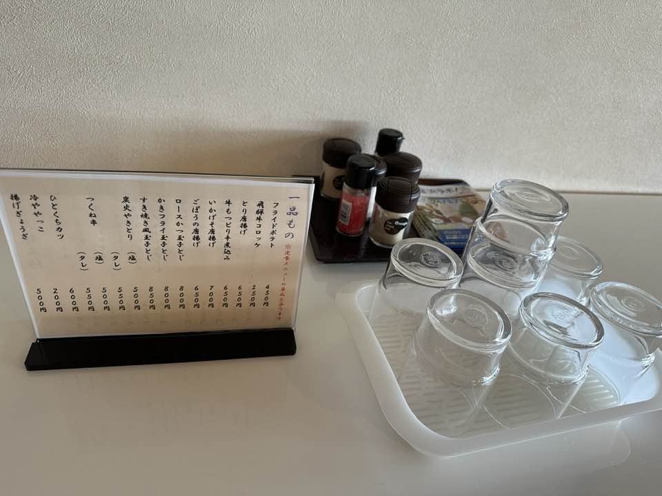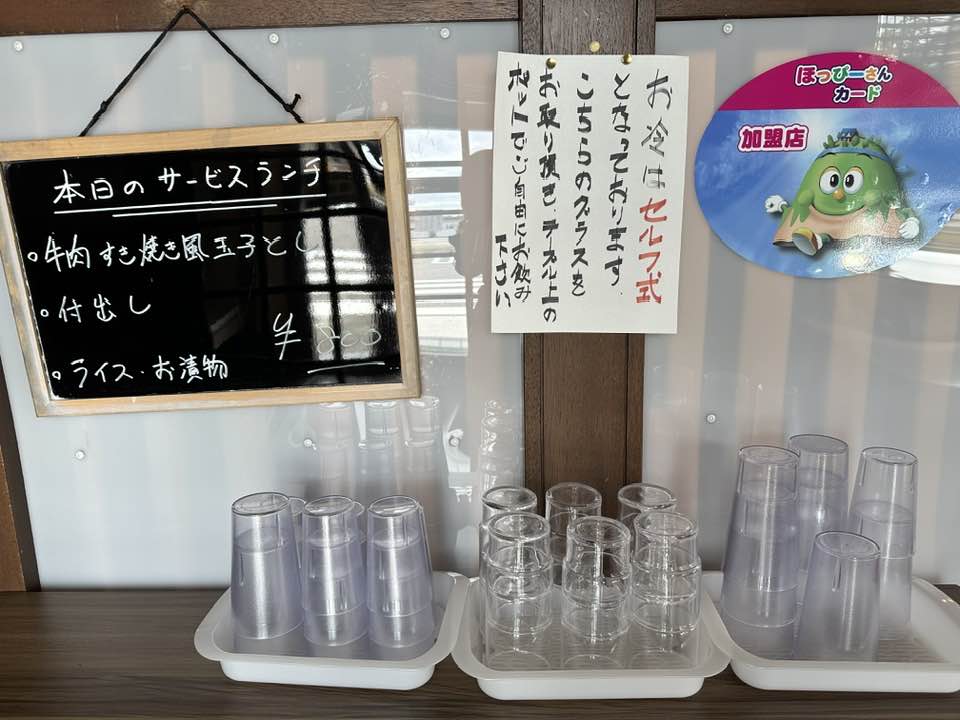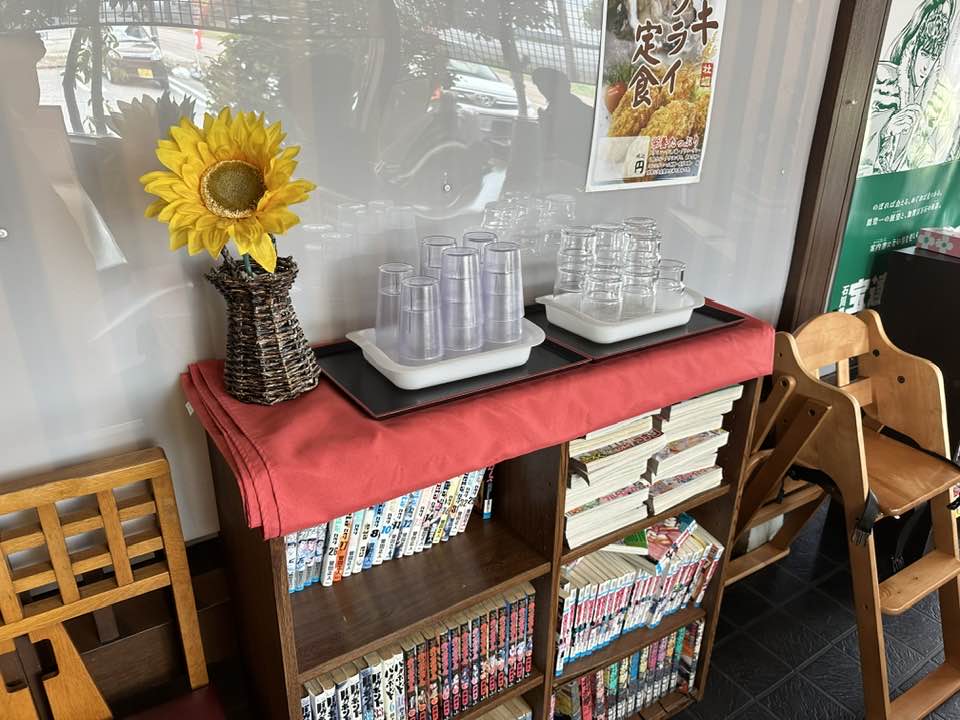 カウンター席の後ろにも、セルフサービスのコップが置いてあります。近くにあるので便利ですね。