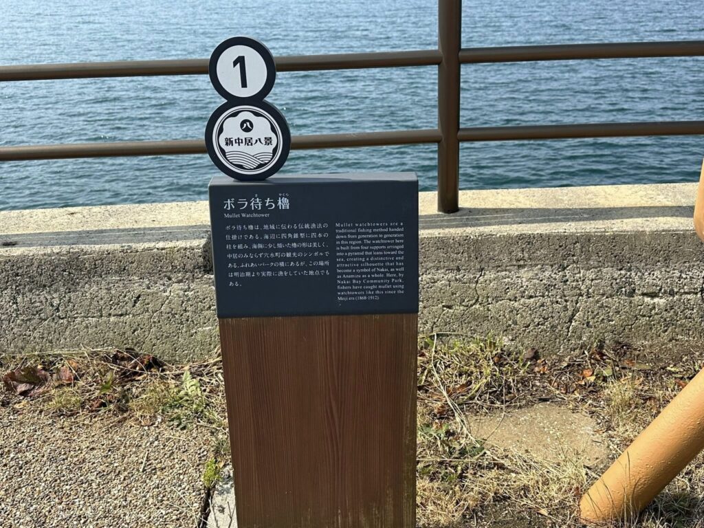 この中居湾ふれあいパークには、新中居八景の1番として「ボラ待ちやぐら」の案内板があります。