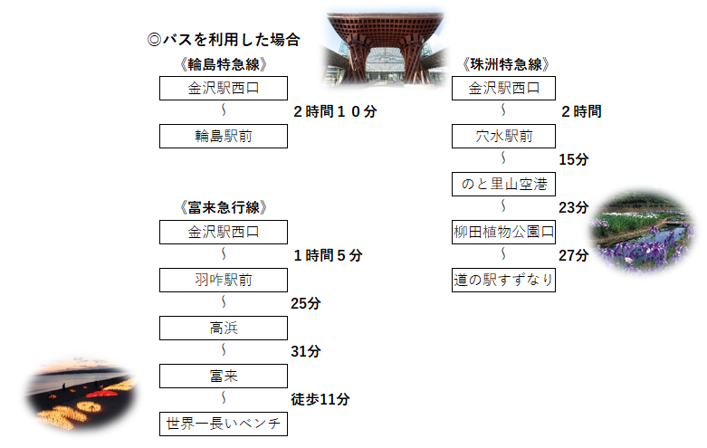そこで、皆さまが、能登の旅のプランを考えるにあたり、見本となるルートの移動時間をまとめてみました。