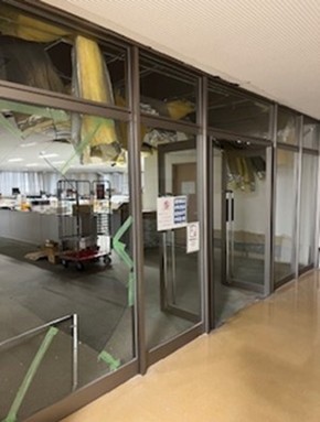 事務室の扉のガラスが割れ、天井も一部落ちていたそうです。