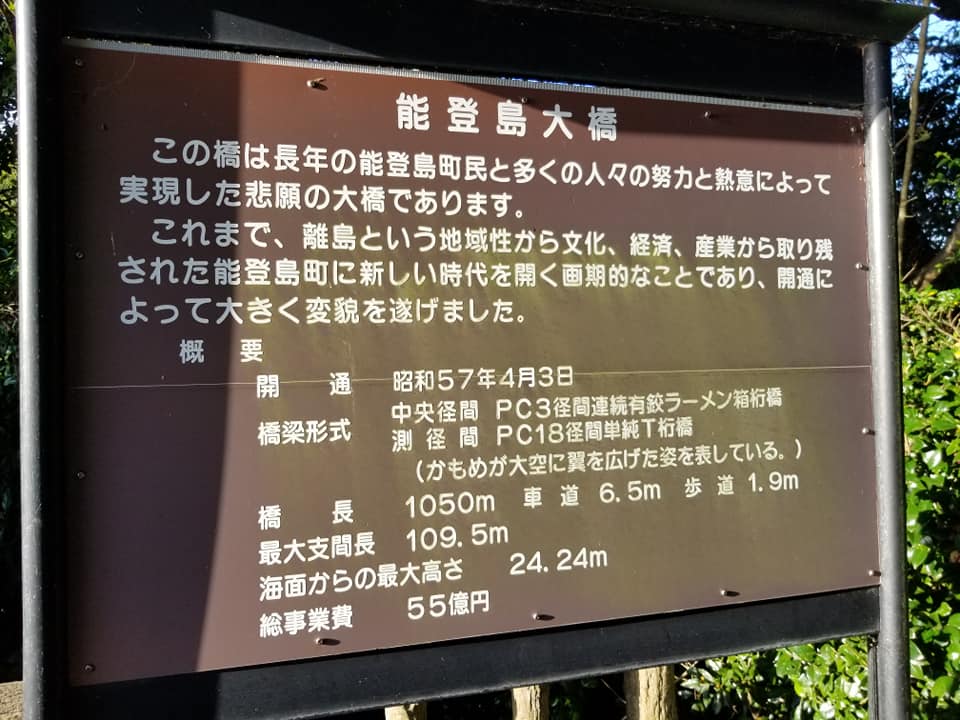 「能登島大橋:この橋は長年の能登島町民と多くの人々の努力と熱意によって実現した悲願の大橋であります。