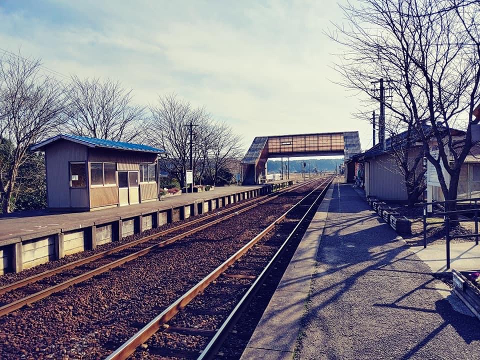 「能登中島駅」のホームから見える、どこまでも続く線路。はとても美しい風景です。