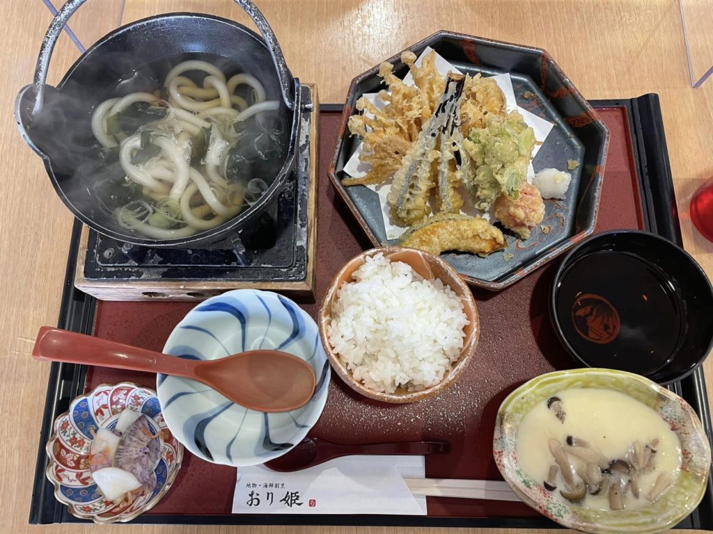 おり姫御膳(刺身、天ぷら、小鉢、釜飯) 1600円