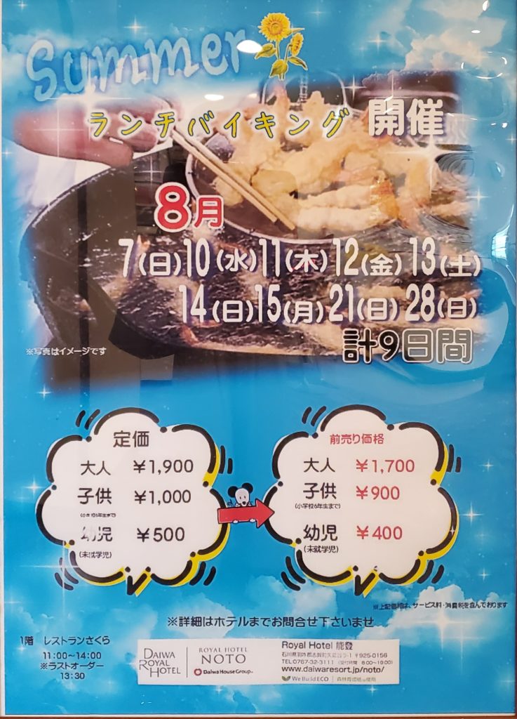 レストラン入り口にある看板に、サマーランチバイキングのポスターが掲示されていました。8月7日(日)、10日(水)、12日(金)、13日(土)、14日(日)、15日(月)、21日(日)、28日(日)の9日間の日程で開催されます。