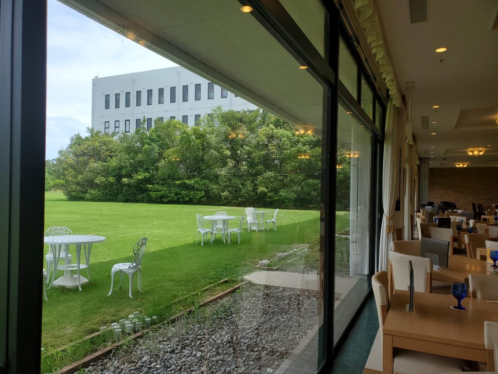 私が案内されたお席は窓際で、こちらの大きな窓からは緑鮮やかな芝生広場を眺めなることができます。