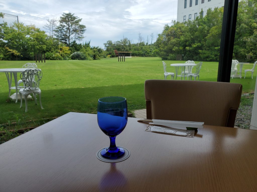 テーブルには青いグラスがセットされており、ブルーのグラス越しに写真を撮ってみましたよ。