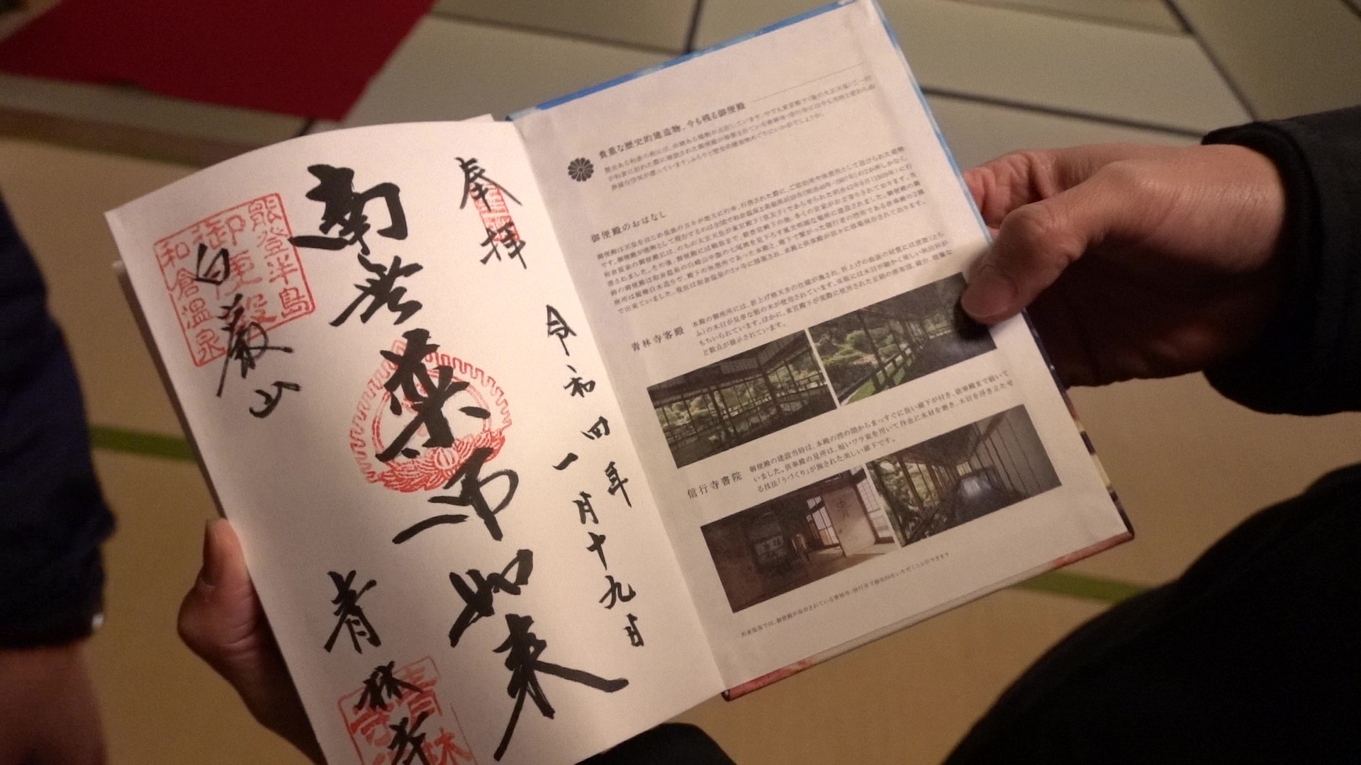 青林寺さんの御朱印がすでに押されていますので、まずは御便殿の供奉殿部分が移築されている和倉の信行寺さんへ行かれて、そのあと全国のお寺巡りの際に使ってもらえればとの事です。