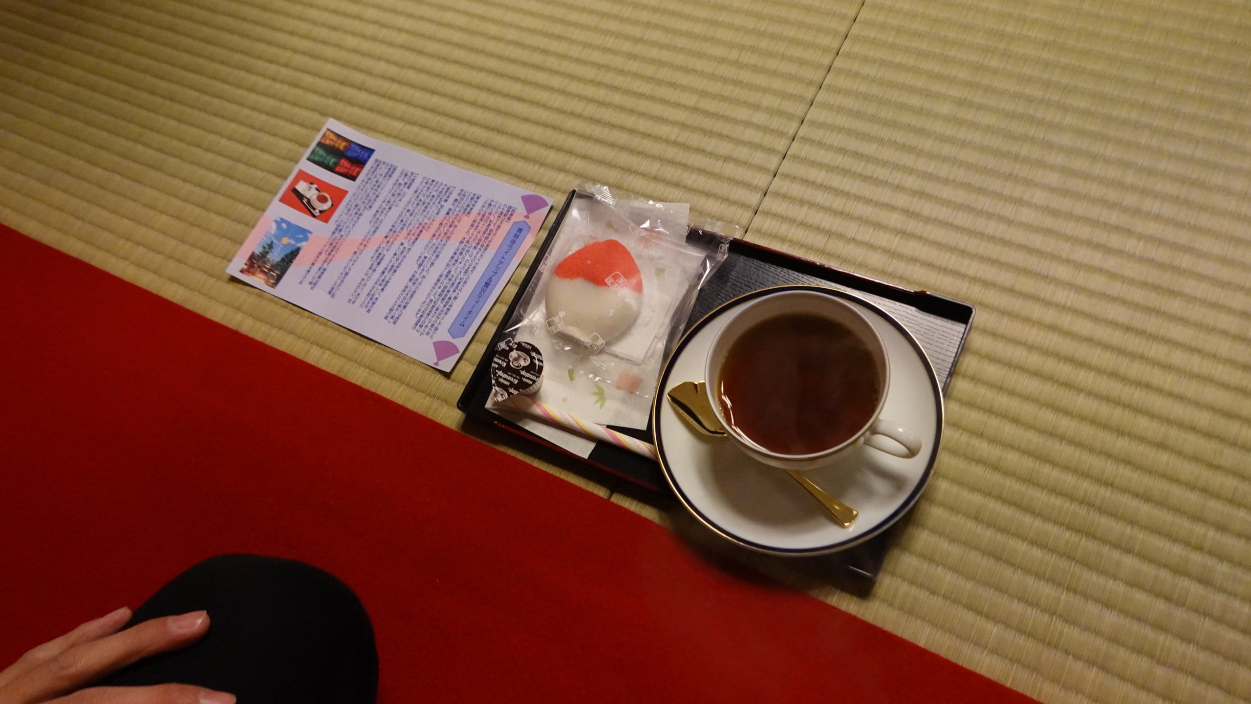 赤い毛氈の上に移動し座っていると、お茶とお菓子が運ばれてきました。