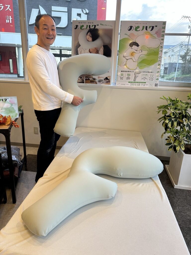 その一つ、中川さん考案の抱き枕のとハグです。能登半島の形をしていることと、能登産の珪藻土入りの生地を使っているのが特徴です。