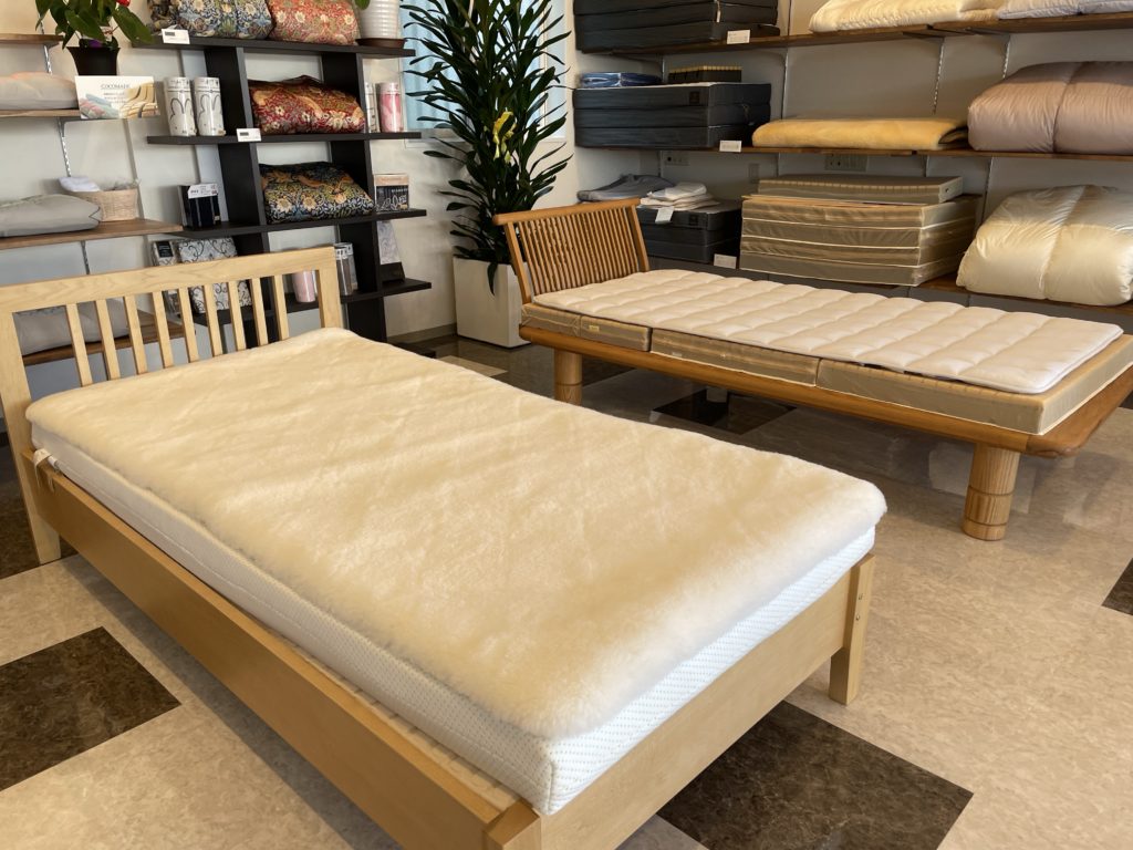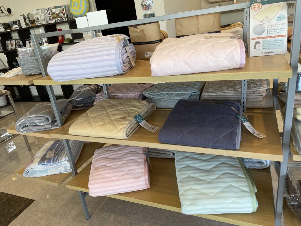 寝具店なので、当然ベッドや布団、シーツなどが並んでいます。