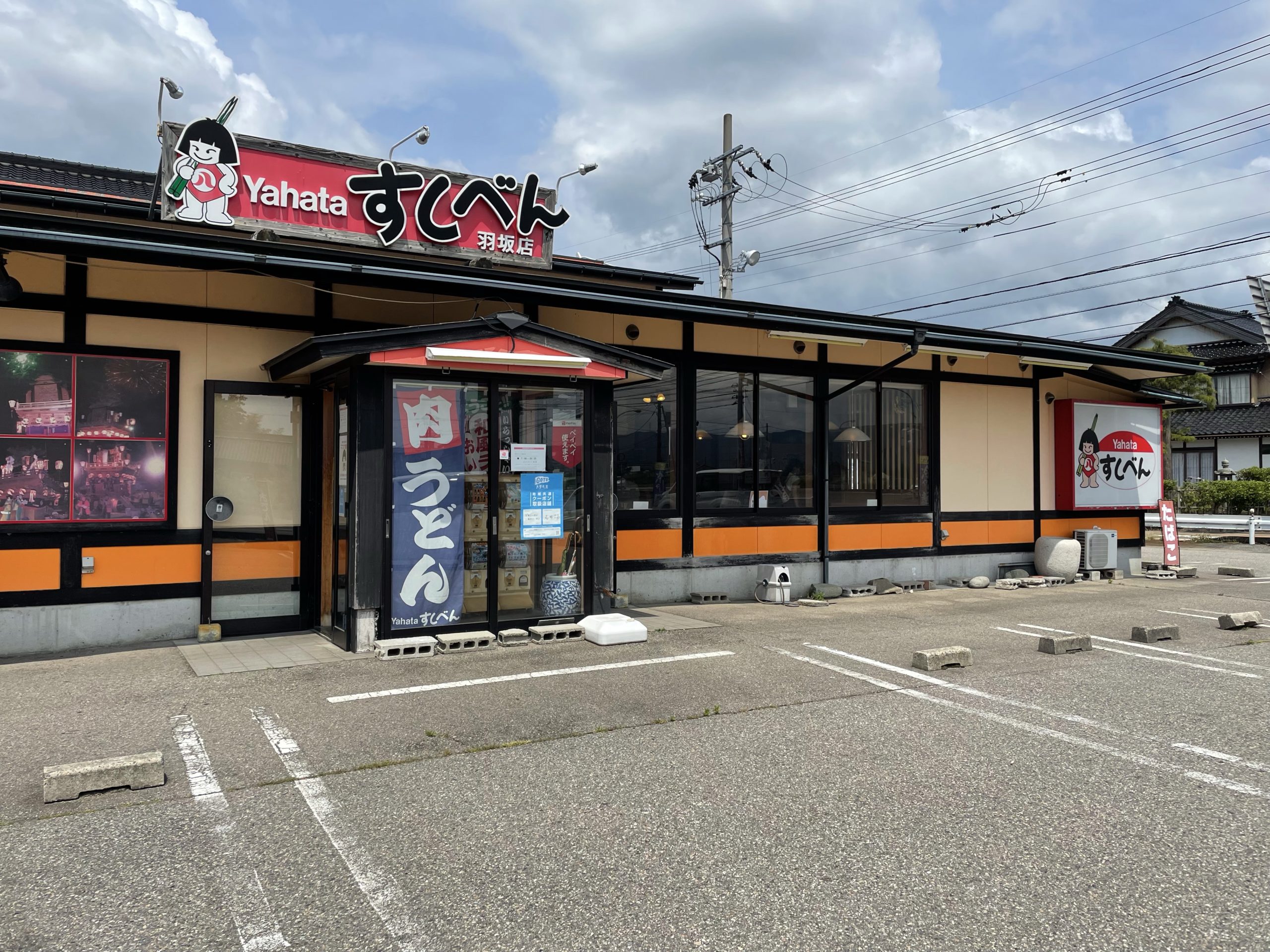 Yahataのすしべん羽坂店は、七尾と羽咋を結ぶ主要道路、七尾羽咋線沿い、中能登町の羽坂の交差点角にあります。道路を挟んでセブンイレブンがあります。大きい交差点の角ですが、出入りがしにくいことはなく、駐車場も広めなので利用しやすいと思います。