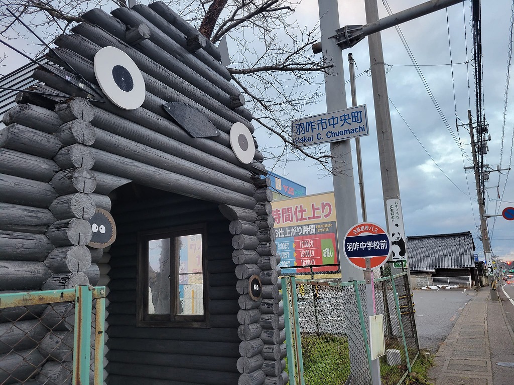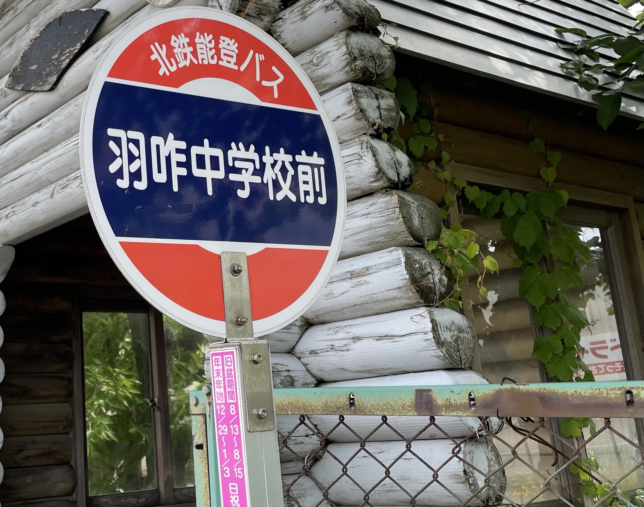 こちらの場所は、羽咋市の市街地。バス停の名前は羽咋中学校前です。