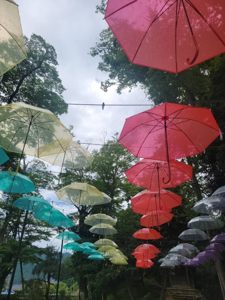 道を挟んで立つ木々を利用して、色とりどりの傘がつりさげられています!