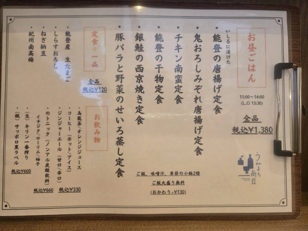 うみまち商店のランチは、メインを選べる定食スタイル。すべてのご飯に、お味噌汁と季節の小鉢2種がセットになっています。さらに、ご飯の大盛りは無料です!