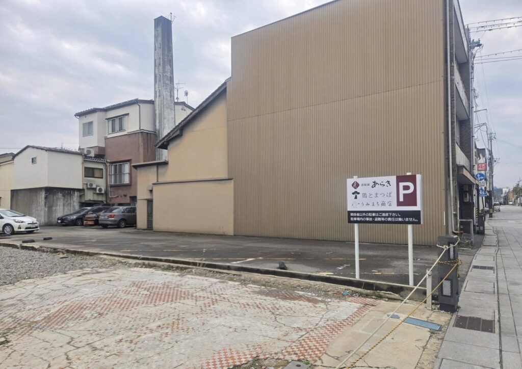 こちらの駐車場は、漆陶舗あらき、鶏とまつば、うみまち商店の3店舗共同の駐車場となっています。