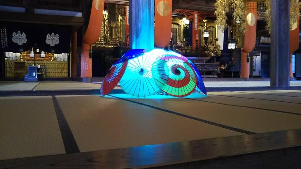 和傘を組み合わせたオブジェが法堂や回廊に置かれており、赤や黄色、青や緑と光の色が変わり、なんとも言えない幻想的な雰囲気に包まれます。