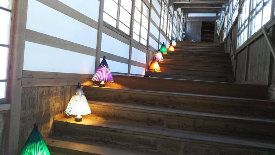 階段にも可愛い和傘が置かれています。和傘の光の色は変化しませんが、白、ピンク、赤、黄、緑、水色、青、紫の8色の光に照らされています。