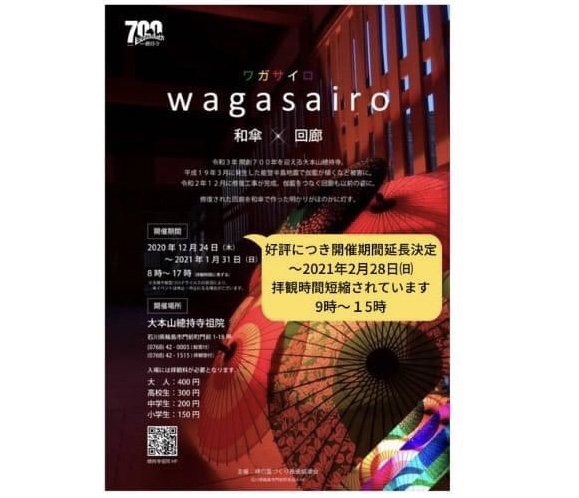 輪島市門前町の曹洞宗大本山総持寺祖院で、能登半島地震からの復興工事が完了したことを記念し、修復の終わった回廊を和傘と明かりで彩るイベント「wagasairo(ワガサイロ)和傘×回廊」が開催されています。