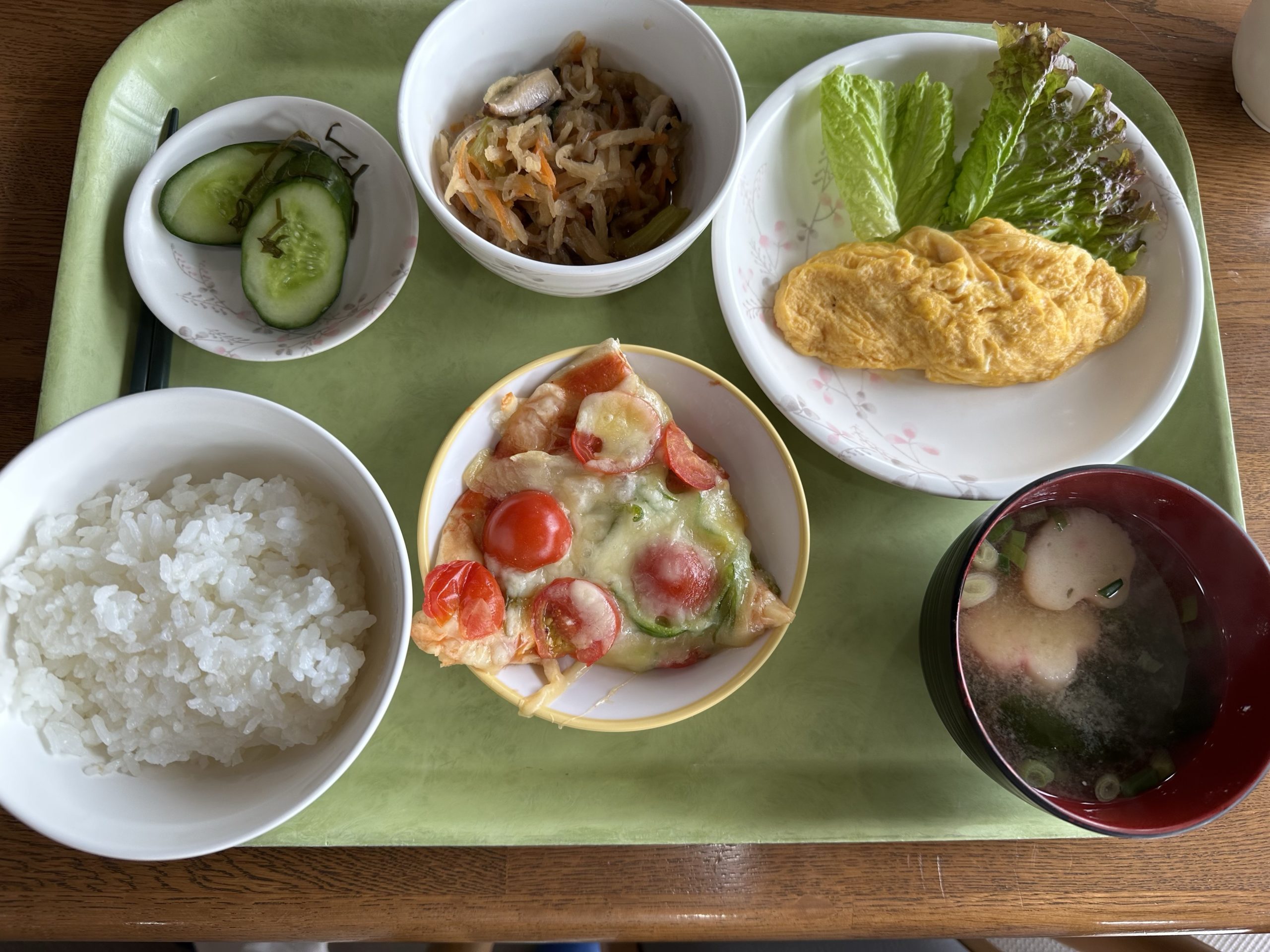 朝ご飯には、オムレツとピザ!生地も自家製でトマトたっぷりの食べ応えのあるおいしいピザでした!