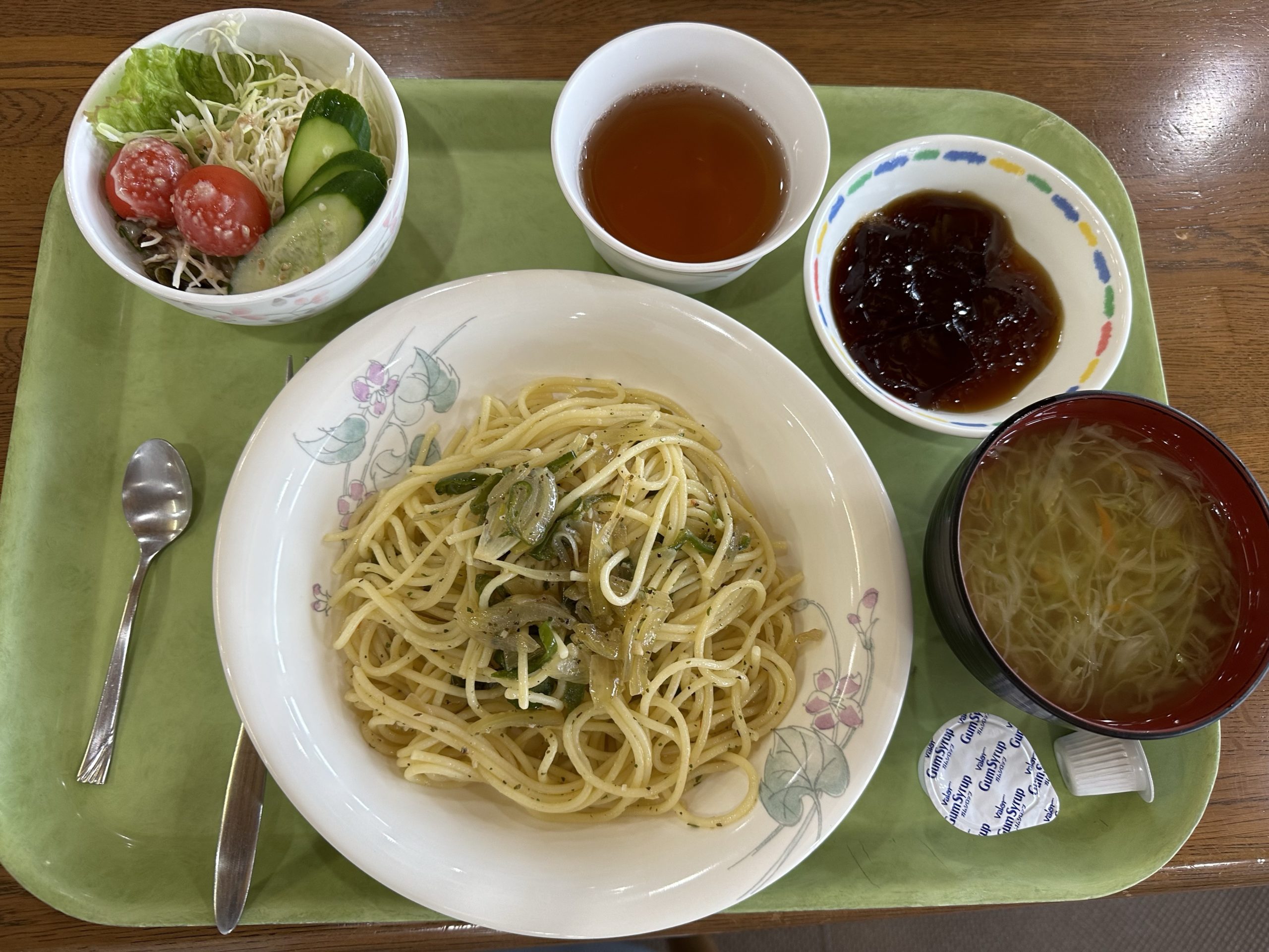 この日は、パスタでした。デザートのコーヒーゼリーもおいしかったです。
