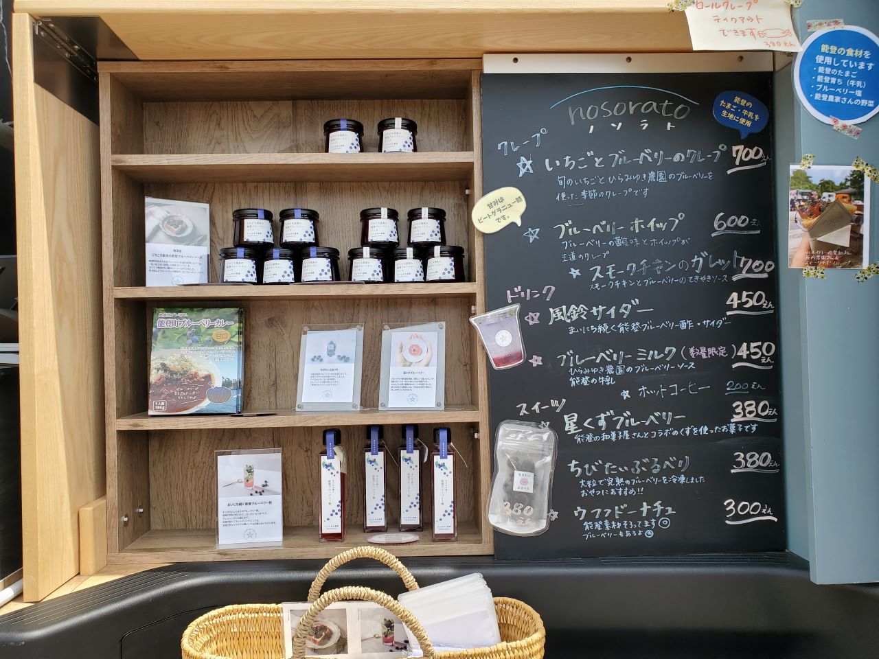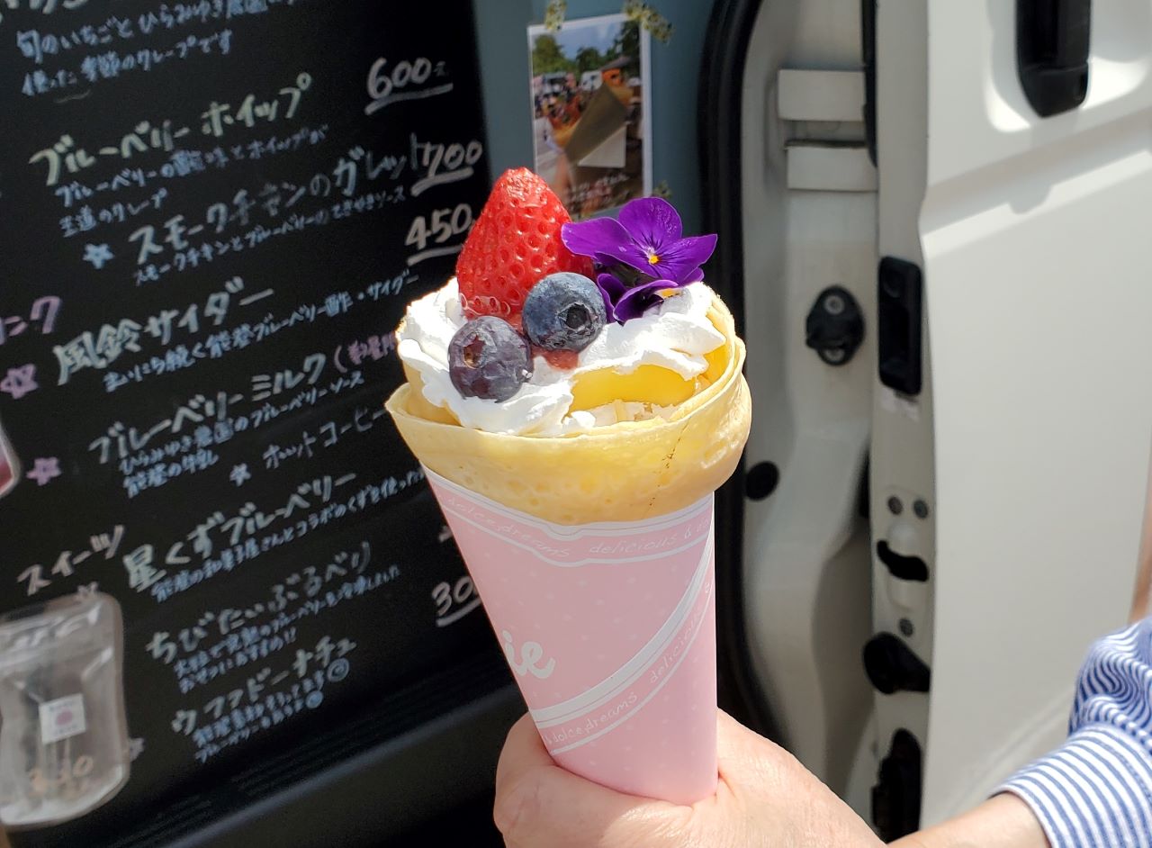 キッチンカーでは、摘み立てのブルーベリーをたくさん使ったクレープやドリンクを販売しいます。食材にもこだわり、クレープなど販売商品は、能登のみなさんが作る野菜、卵、牛乳、塩、スモークチキンなど、色々な美味しいものを集めて作られているそうです。